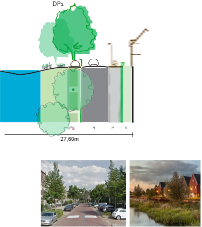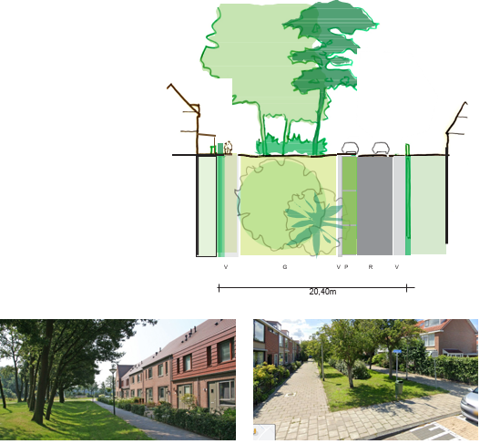 De groene dwarsverbindingszone door de wijk. Het profiel bestaat uit een 10 meter brede groenzone met een variatie van bomen en beplanting, met aan 1 zijde een toegangsweg en aan de andere zijde een voetpad.