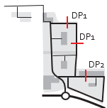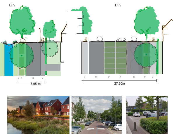 De woonstraten in de twee noordelijke woonblokken (DP1) grenzen aan 1 zijde aan het agrarisch gebied, waarbij sloten met natuurvriendelijke oevers de grens vormen. De woonstraten in het zuidoostelijk gelegen blok (DP2) is stenig van karakter vanwege de parkeerterreinen nabij de 2 appartementencomplexen.