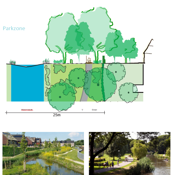 De parkzone speelt een belangrijke rol in de groene uitstraling en beleving van de wijk. Deze zone van 25 meter wordt deels met een brede sloot ingericht en deels met een beplantingszone, waar ruimte is voor sport, spel en recreatie.