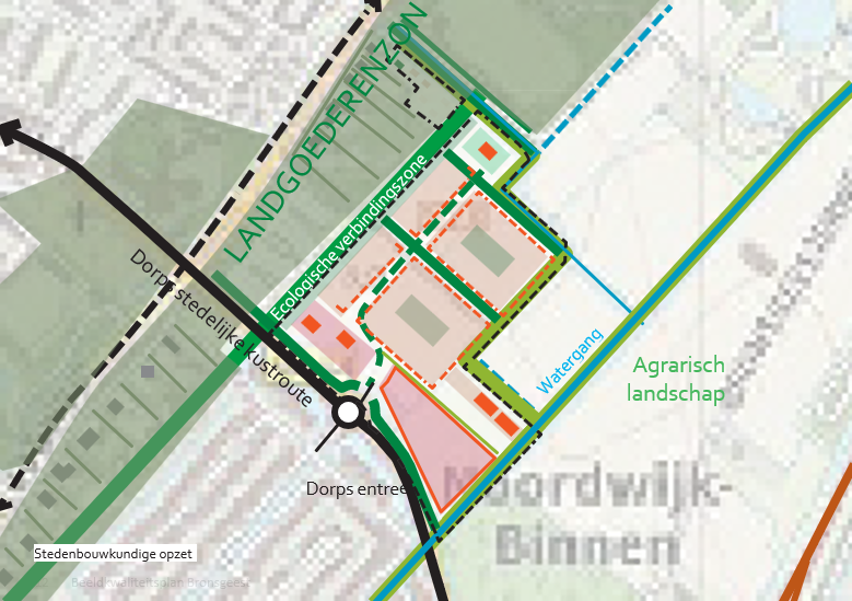 Het plan beoogt een goede orientatie van bebouwing naar het open landschap door de wegen met voorkanten van de bebouwing zoveel mogelijk aan de kant van het open landschap te leggen. Tussen de centrale laan en het open landschap is in het stedenbouwkundig plan de bebouwing in blokken en stroken georganiseerd. Het landelijke karakter krijgt gestalte door toepassing van bomen in het straatbeeld en een variatie van architectuur van woonbebouwing.
