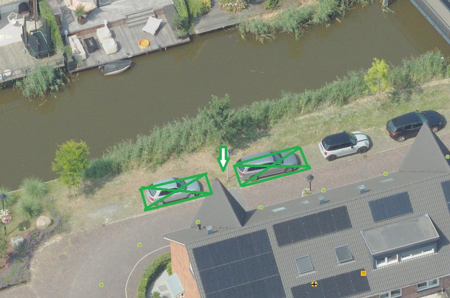 De parkeerplaatsen zijn alleen bedoeld voor het opladen van elektrische auto’s. Daarom plaatsen we het verkeersbord E08c (dit staat in bijlage I van het RVV 1990). We plaatsen ook het verkeersbord OB504 daaronder. Dit is een bord met twee pijlen die wijzen naar de parkeerplaatsen.