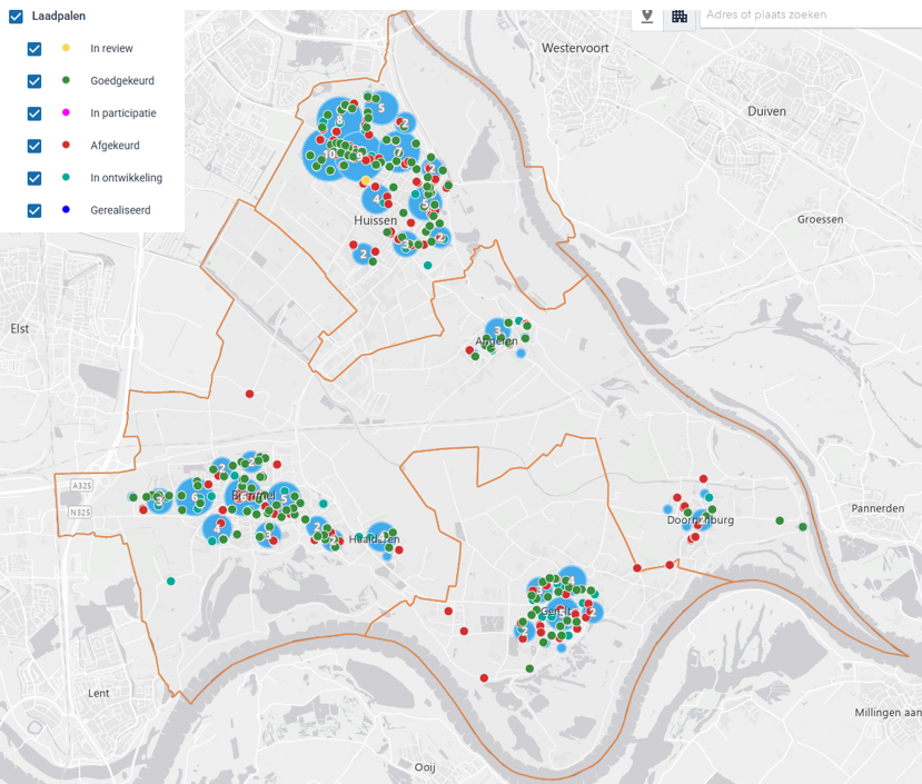 Onderstaande de kaarten van de aanwezigheid van publieke, semi-publieke (bedrijven) en private laadpunten in gemeente Lingewaard in december 2024. Rijders van elektrische voertuigen kunnen 24 uur
