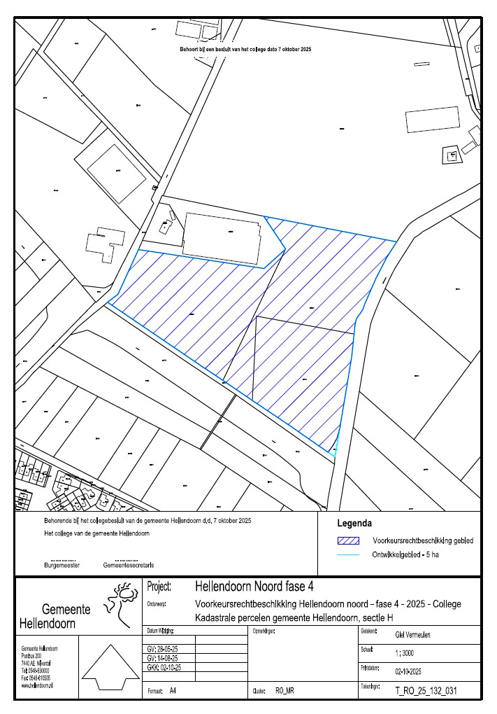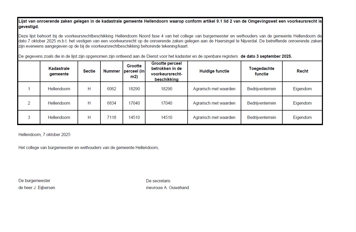 Het college van burgemeester en wethouders van de gemeente Hellendoorn maakt op grond van artikel 16.32b van de Omgevingswet bekend dat op 7 oktober 2025 een voorkeursrechtbeschikking is genomen op basis van artikel 9.1, tweede lid van de Omgevingswet.