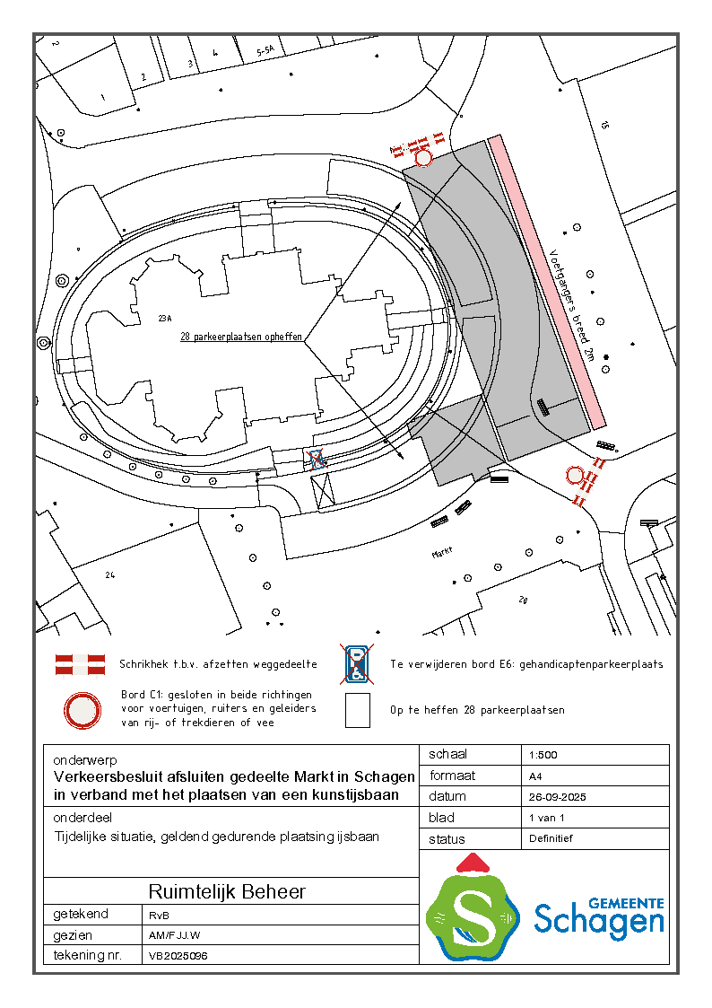 Voor de aankomende periode van drie jaar in de maanden november t/m januari 2025 tot en met 2028 zal, vanwege het evenement ‘Schagen on Ice’ op de Markt, Schagen een kunstijsbaan worden aangebracht. Voor de plaatsing van de kunstijsbaan is het nodig om de weg afgesloten te hebben voor het autoverkeer. Ook zullen circa 28 parkeerplaatsen en 1 algemene gehandicaptenparkeerplaats niet beschikbaar zijn. Hiervoor zullen op de aangegeven locaties afzettingen worden geplaatst. Voor voetgangers komt er een route langs over de terrassen op de Markt. Fietsers krijgen een omleidingsroute via het Rensgars. Het autoverkeer wordt vanaf de noordzijde omgeleid via de N245. Het gaat hier om een tijdelijke verkeersmaatregel waarvoor we een verkeersbesluit nemen.
