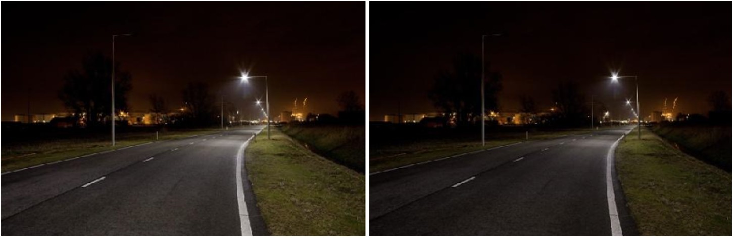 Onderstaande foto’s geven een doorgaande weg weer waarbij op de linker foto de verlichting op 100% brandt en op de rechter foto op 70%.
