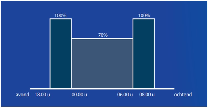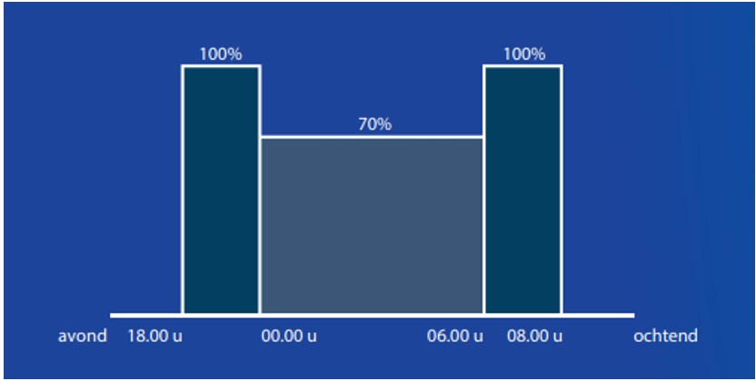 Vanaf inschakelen tot middernacht brandt de verlichting op 100%. Vanaf middernacht tot 6 uur brandt de verlichting op 70%. Vanaf 6 uur tot uitschakelen brandt de verlichting op 100%