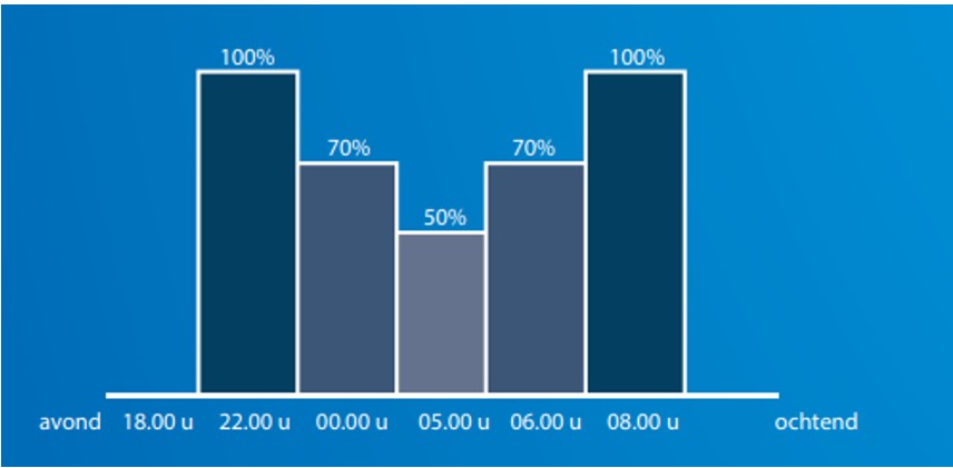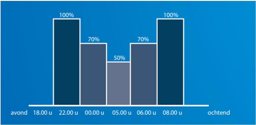 Vanaf inschakelen tot 22.00 uur brandt de verlichting op 100%. Vanaf 22.00 uur tot middernacht brandt de verlichting op 70%. Vanaf middernacht tot 5 uur in brandt de verlichting op 50%. Vanaf 5 uur tot 6 uur brandt de verlichting op 70%. Vanaf 6 uur tot uitschakelen brandt de verlichting op 100%.