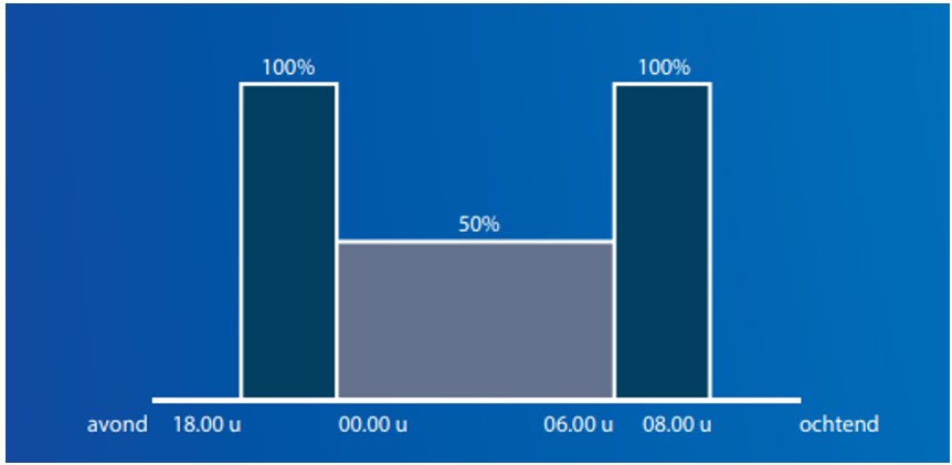Vanaf inschakelen tot middernacht brandt de verlichting op 100%. Vanaf middernacht tot 6 uur brandt de verlichting op 50%. Vanaf 6 uur tot uitschakelen brandt de verlichting op 100%.
