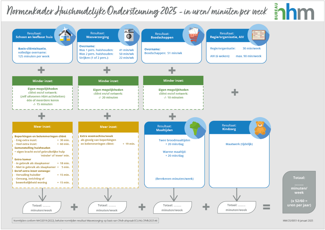 De normtijden en het niveau van schoon dat behaald kan worden bij de verschillende producten huishoudelijke ondersteuning zijn gebaseerd op het HHM Normenkader (hierna: het normenkader). Het normenkader is gebaseerd op een onafhankelijk onderzoek, uitgevoerd door KPMG Plexus en Bureau HHM. In december 2018 bevestigde de CRvB in haar uitspraak dat dit normenkader voldoet aan de eisen die in mei 2016 werden gesteld aan de onderbouwing van normtijden. In januari van 2025 is het normenkader ten aanzien van de wasverzorging aangepast. Het normenkader is in alle gemeenten van toepassing verklaard.