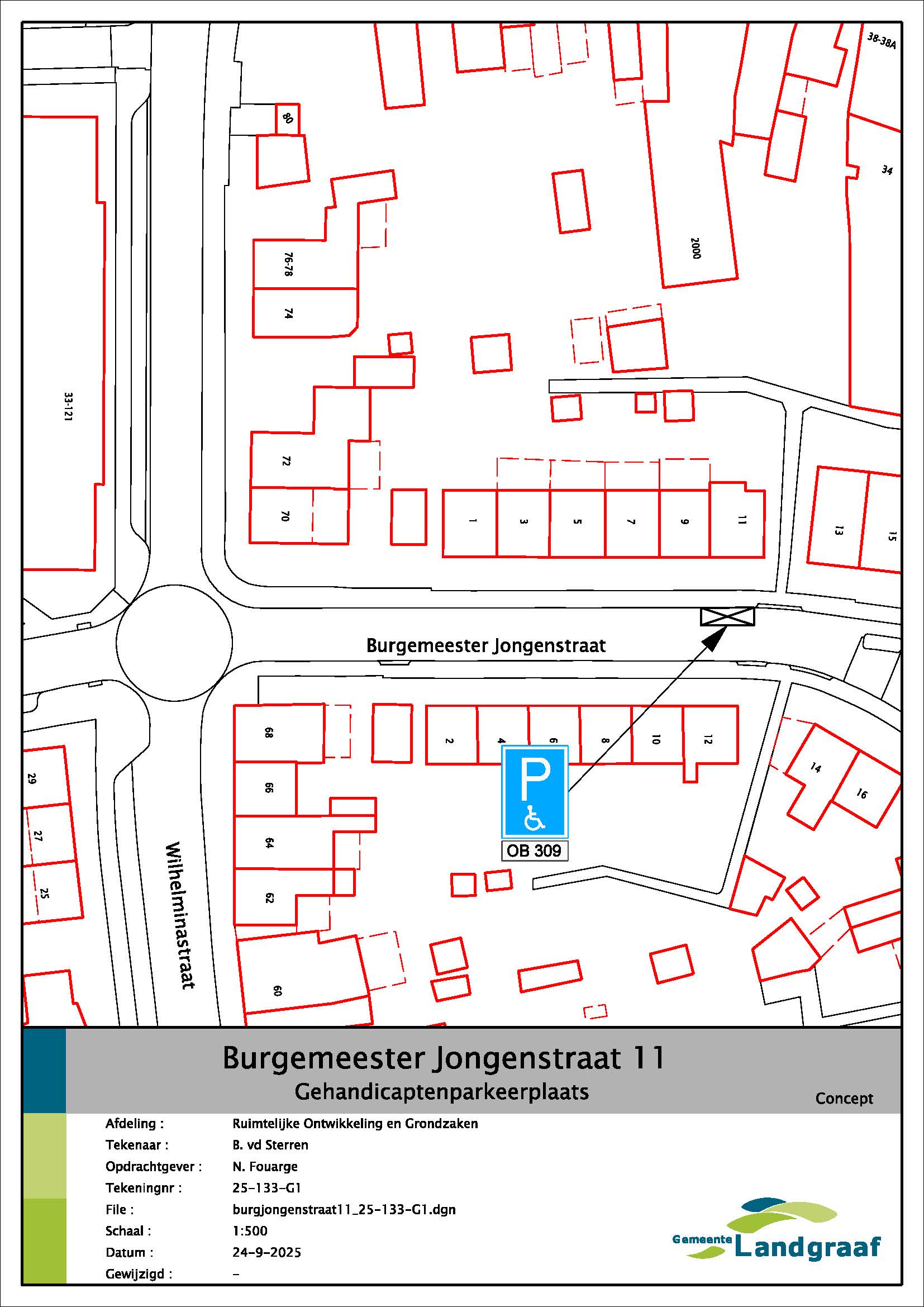 De gemeente heeft een verzoek ontvangen voor het aanwijzen en inrichten van een gehandicaptenparkeerplaats op kenteken nabij de Burgemeester Jongenstraat 11.