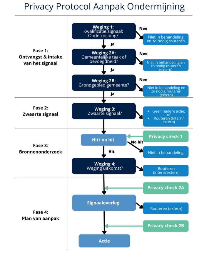 In fase 3 van het protocol beoordeelt de PO of de AVG-coördinator binnen Privacy check 1 welke gemeentelijke bronnen gebruikt kunnen worden om het specifieke signaal te onderzoeken. In fase 4 beslist de PO of de AVG- coördinator binnen Privacy check 2A & 2B welke gegevens, die zijn verzameld in fasen 1 t/m 3, gedeeld kunnen worden met de relevante gemeentelijke afdelingen om verdere stappen te bepalen. Daarnaast beoordeelt de PO of de AVG-coördinator welke gegevensuitwisseling binnen de gemeente nodig is om deze stappen uit te voeren en of dit toelaatbaar is. Om te bepalen welke binnengemeentelijke gegevensuitwisseling is toegestaan, moet altijd worden gekeken naar de specifieke wettelijke regeling die van toepassing is op de betreffende gemeentelijke informatie.