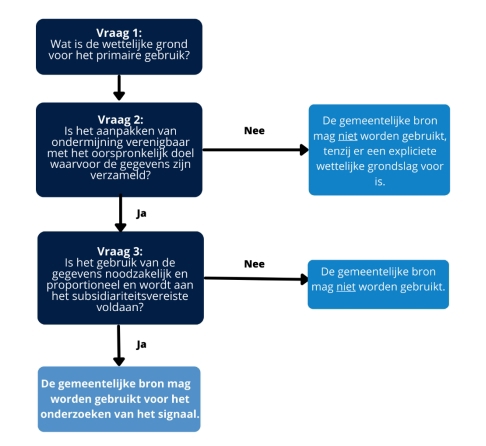 Aanvankelijk wordt vastgesteld welke persoonsgegevens nodig zijn voor het onderzoek naar een signaal en op basis daarvan wordt bepaald voor welke gemeentelijke taak deze gegevens oorspronkelijk zijn verkregen (ook wel: het primaire gebruik van de gegevens). Om dit te bepalen, wordt gekeken naar de wettelijke basis van de betreffende gemeentelijke taak, bijvoorbeeld in de Gemeentewet of de Drank- en Horecawet.