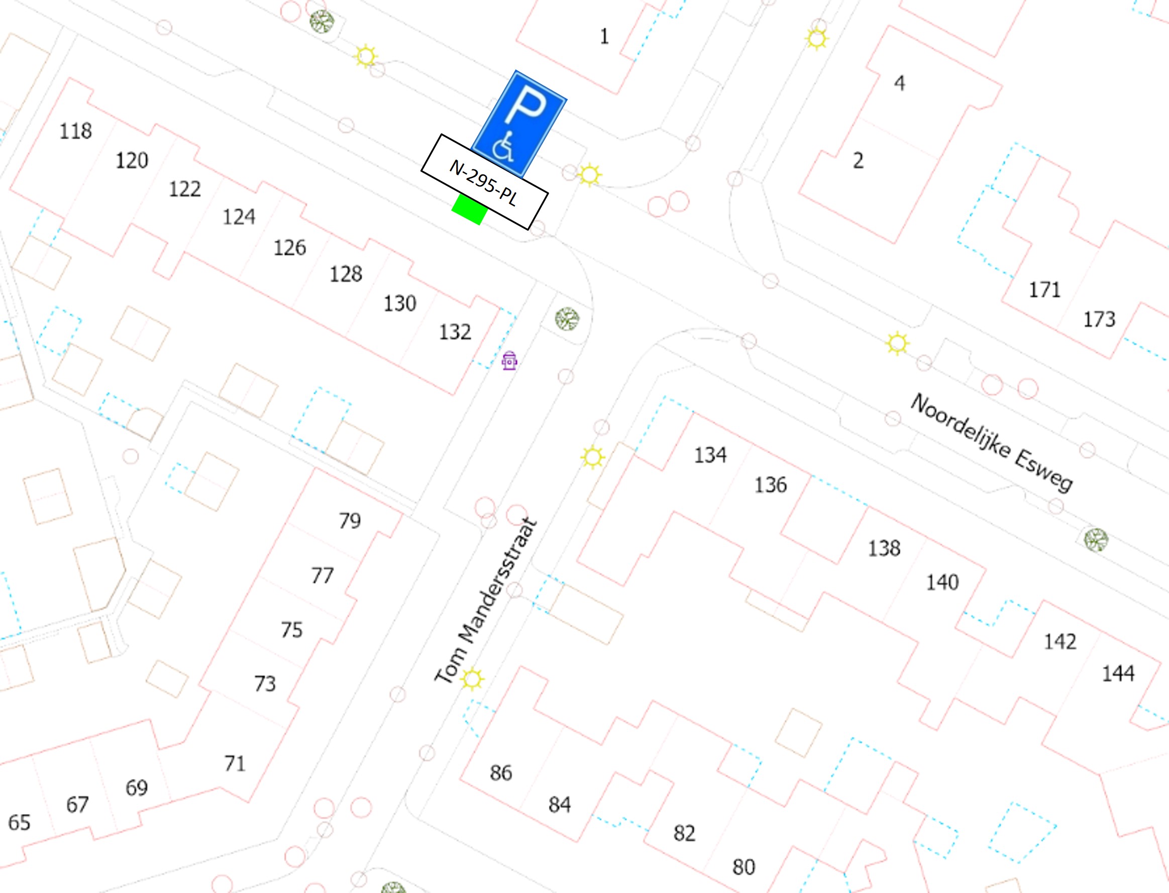 Het aanwijzen en inrichten van een gehandicaptenparkeerplaats op kenteken aan de Noordelijke Esweg, ter hoogte van nummer 130, door het plaatsen van het verkeersbord E6 van het RVV 1990 met onderbord met kenteken N-295-PL, zoals is aangegeven op de overzichtstekening in dit besluit.