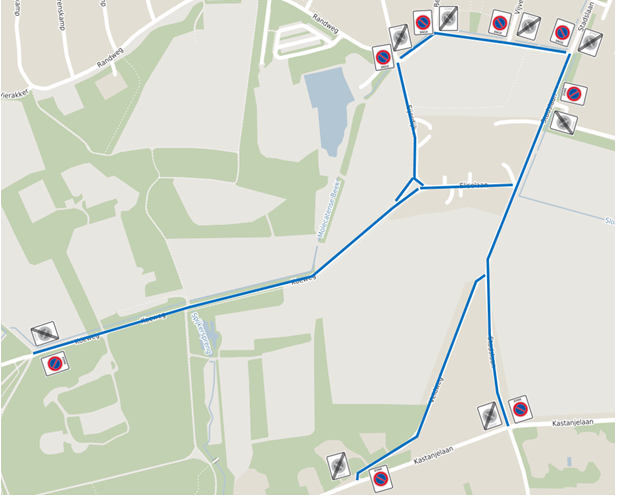 dat deze maatregel van kracht is op vrijdag 17 oktober en zaterdag 18 oktober 2025 door middel van het plaatsen van bord E1 (zonale toepassing begin en einde) van bijlage 1 van het RVV 1990 (parkeerverbod) voor beide zijden van de weg;