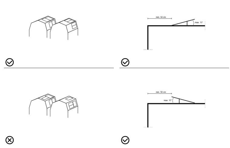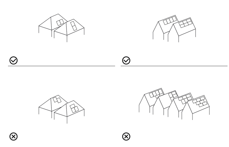 Onderstaande tekeningen geven een impressie van een regelmatige rangschikking van zonnepanelen op een zadeldak, schilddak, mansardekap en plat dak.