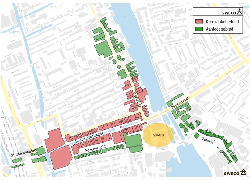 In bovenstaande kaart is de afbakening van het Stadshart Zaandam opgenomen. Het kernwinkelgebied bestaat uit de Gedempte Gracht en een klein stuk zuidelijk Westzijde tot de Stationsstraat. De aanloopgebieden zijn het Stadhuisplein, de Westzijde vanaf de Stationsstraat tot Klokbaai/De Faam, de Rozengracht, de Rozenhof, het deel Gedempte Gracht vanaf de Dam, de Beatrixbrug en een stukje Peperstraat en het noordelijk deel van de Zuiddijk. De Dam is als horecaconcentratiegebied bestempeld.