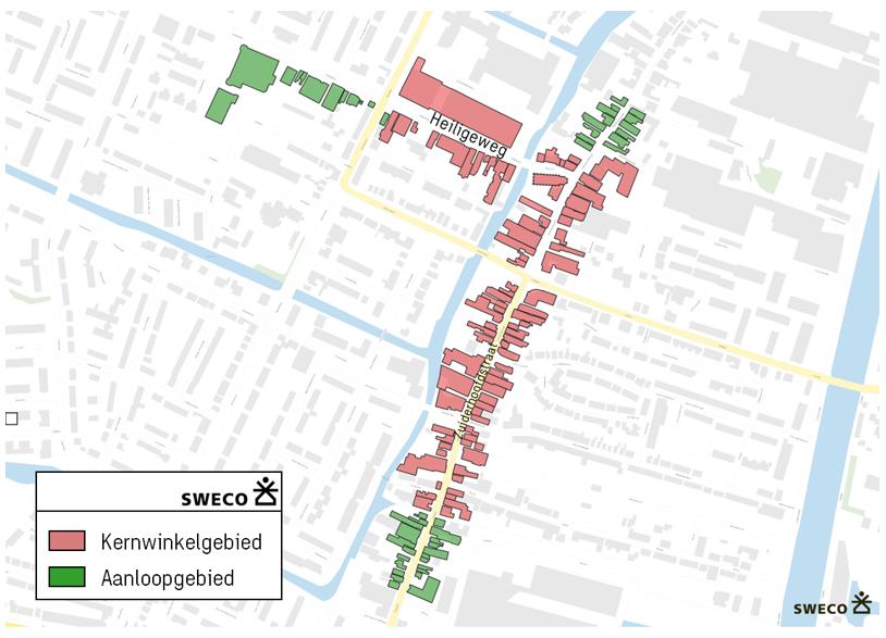 Het kernwinkelgebied bestaat uit de Zuiderhoofdstraat vanaf de Vlietsend, lopend tot de Noorderhoofdstraat en haaks daarop het oostelijk deel van de Heiligeweg (inclusief Kerkplein) tot de Eikelaan/Weverstraat. De aanloopgebieden zijn het zuidelijk deel van de Noorderhoofdstraat tot de Vermaningsstraat, het noordelijk deel van Vlietsend tussen Weiver en Jean Henri Dunantstraat en het westelijk deel van de Heiligeweg tussen de Eikelaan en Jan van Beaumontstraat.