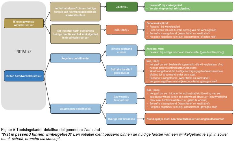 Bij beoordeling van nieuwe detailhandelsinitiatieven (zowel nieuwvestiging als uitbreiding) in de gemeente Zaanstad wordt het afwegingskader zoals hier weergegeven gebruikt. In het afwegingskader speelt mee of een initiatief binnen of buiten de gewenste winkelstructuur ligt en welk type branche het betreft. Daarnaast zal per initiatief gekeken worden of het passend is, of het positief bijdraagt aan het functioneren van het cluster en of de structuur versterkt wordt. Het toetsingskader is gericht op het versterken van de hoofdstructuur. Voor initiatieven buiten de hoofdstructuur geldt in de meeste gevallen een ‘nee, tenzij’ principe. Deze uitzondering betreft bestaande solitaire tuincentra en bouwmarkten die willen optimaliseren en supermarkten die willen optimaliseren of verplaatsen.
