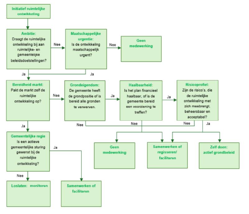 Bij elke ruimtelijke ontwikkeling kiest de gemeente de meest geschikte vorm: actief, passief of een tussenvorm. Dit noemen we situationeel grondbeleid (2.4). Hoe de gemeente deze keuze maakt, staat in het afwegingskader grondbeleid (2.6).