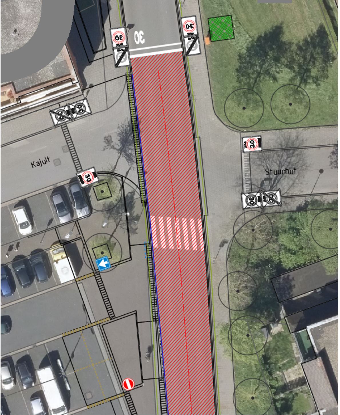 De Lijzijde zal onderdeel worden van het 30 km/h-zone regime die in de omliggende (woon)straten al geldt. Op de kruispunten met de Stuurhut en Kajuit wordt het asfalt voorzien van een rode kleur om zo de attentiewaarde te verhogen en de herkenbaarheid van een 30 km/h-zone te versterken. Daarnaast wordt er ter hoogte van de bushaltes bij het winkelcentrum de rijbaan versmald en worden de bestaande zebrapaden op een meer logische plek teruggebracht. De inritconstructies naar de parkeerterreinen bij het winkelcentrum worden tevens aangepast waardoor er meer overzicht ontstaat bij op- of afrijden. Bij beide inritconstructies naar de parkeerterreinen toe wordt een rijrichting met bebording en pijlmarkering aangegeven.