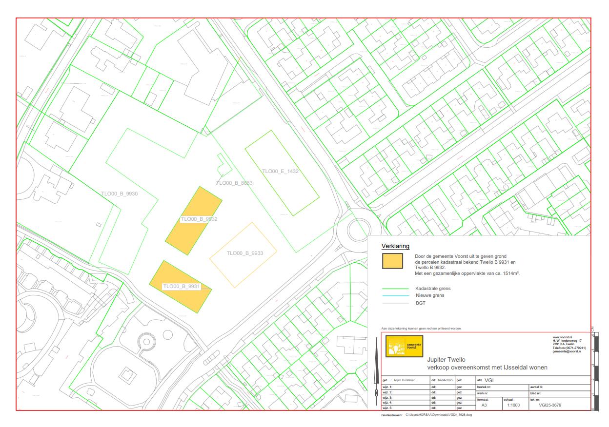 De gemeente Voorst is van plan om gronden gelegen in Twello op de locatie Hietweideweg-Jupiter (locatie voormalig Veluws College, de brandweerkazerne en de gemeentewerf), met een oppervlakte van ongeveer 1.514 m², te verkopen. Het gaat om percelen grond met de kadastrale aanduiding Twello, sectie B, nummers 9931 en 9932 waar Stichting IJsseldal Wonen (woningcorporatie binnen de gemeente Voorst) 29 huurwoningen (beneden-/bovenwoningen en een appartementencomplex) gaat (laten) bouwen.