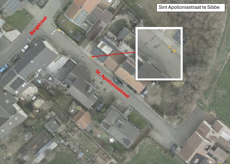 Locatie voor het aanbrengen van een onderbroken gele streep ter markering van een gedeeltelijk parkeerverbod op de Sint Apolloniastraat te Sibbe.