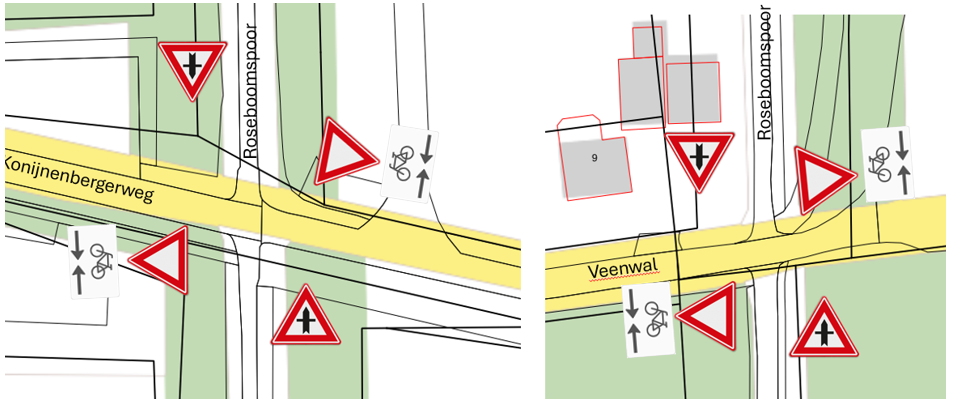 • doormiddel van het plaatsen van verkeersborden B3 en B6 inclusief OB02 + OB503 van bijlage 1 van het RVV 1990, inclusief het aanbrengen van haaientanden op het wegdek, een voorrangsregeling in te stellen waarbij verkeer komende vanaf de Konijnenbergerweg en de Veenwal voorrang dient te verlenen aan het verkeer op het Roseboomspoor;