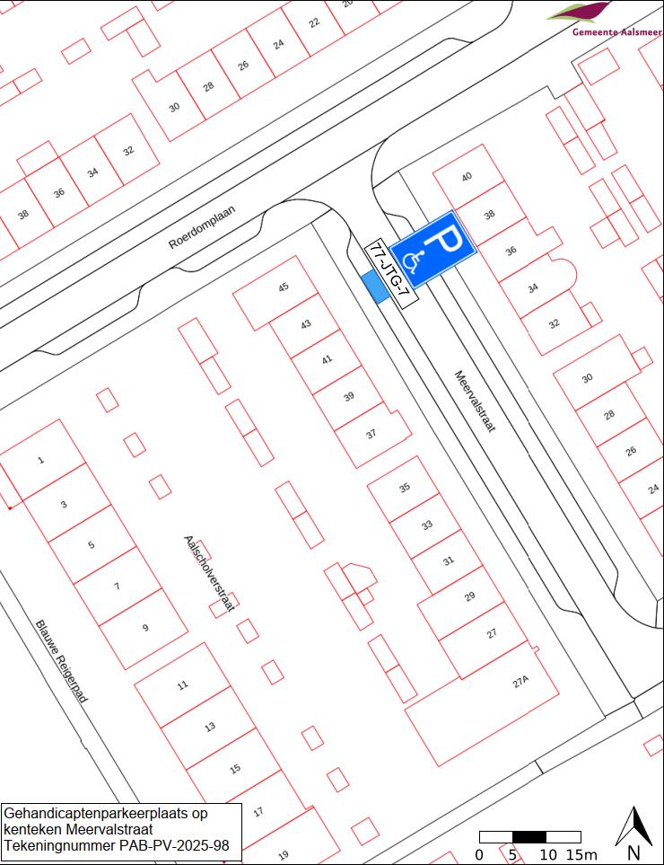 Burgemeester en wethouders van Aalsmeer besluiten het parkeren te verbieden op een parkeerplaats in de Meervalstraat, zoals aangegeven op tekening PAB-PV-2025-98, met uitzondering van het voertuig met het kenteken 77-JTG-7 (gehandicaptenparkeerplaats).