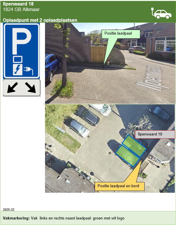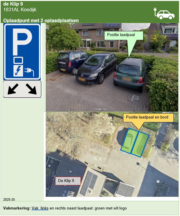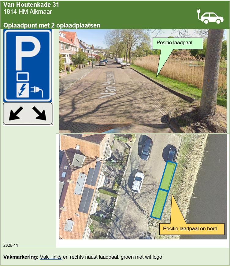 Op de volgende locaties twee parkeerplaatsen aan te wijzen als oplaadpunt voor een elektrisch voertuig. De maatregel zal ter plaatse worden aangeduid door het bord conform model E8c van bijlage 1 van het Reglement Verkeersregels en Verkeerstekens (RVV 1990), parkeergelegenheid alleen bestemd voor het opladen van elektrische voertuigen, en het onderbord OB504.De borden worden geplaatst zoals aangegeven op de bij dit besluit behorende tekeningen.