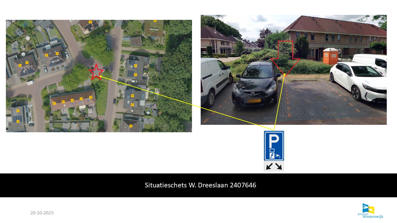 • Het aanwijzen van parkeerplaatsen waar alleen geparkeerd mag worden ten behoeve van het opladen van een elektrisch voertuig van bewoners en bezoekers in de omgeving van de W. Dreeslaan ter hoogte van het huisnummer 79 te Winterswijk. Dit doormiddel van het plaatsen van het verkeersbord E8c conform bijlage 1, behorende bij het Regelement Verkeersregels en Verkeerstekens 1990 (RVV 1990) en onderbord OB504.