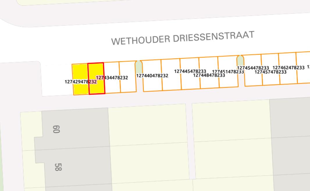 Twee parkeerplaatsen ter hoogte van perceel Wethouder Driessenstraat 60 (parkeervaknummers 127429478232 en 127432478232) aan te wijzen voor het opladen van elektrische voertuigen door het plaatsen van een bord conform model E8c van Bijlage I van het RVV 1990, gecombineerd met onderbord OB504 met daarop afgebeeld twee pijlen op een hoek van 45° (RVV 1990).