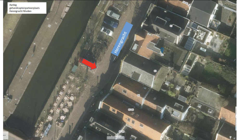 De gemeente Gooise Meren heeft naar aanleiding van een verzoek van een bewoner besloten om met behulp van een kenteken een gehandicaptenparkeerplaats voor de bewoner te reserveren ter hoogte van de woning met het adres Herengracht 64, 1398AC Muiden. Op de situatietekening staat de beoogde locatie van de te reserveren parkeerplaats weergegeven.