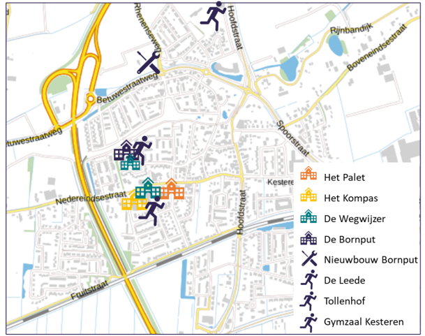 * Hoewel een huisvestingsopgave van Het Palet in Kesteren buiten de scope van het IHP van 16 jaar ligt zijn gemeente en schoolbesturen van mening dat ook deze school mee moet in de scope van het onderzoek. Het aantal leerlingen ligt nu en naar verwachting in de toekomst onder de norm van 99 leerlingen. Schoollocaties met minder dan 99 leerlingen worden op basis van de visie op toekomstbestendigheid en flexibiliteit in beginsel gecombineerd met andere schoollocaties (hoofdstuk 4.3). Door Het Palet mee te nemen in het onderzoek wordt hierop geanticipeerd.