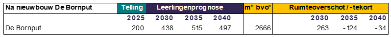 De Bornput ervaart momenteel een aanzienlijk ruimtetekort. Met de geplande nieuwbouw wordt echter ook geanticipeerd op de verwachte groei van het aantal leerlingen. De oplevering van de nieuwe schoollocatie staat gepland voor 2026. Er wordt 2.666 m² aan onderwijsruimte gerealiseerd passend bij de lange termijn behoefte, zoals onderstaand weergegeven.
