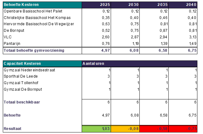 De prognoses tonen een stijging van het aantal leerlingen in Kesteren. Door de groei in het onderwijs neemt ook de behoefte aan ruimte voor gymlessen toe. Op dit moment is het aanbod nog ruim voldoende, maar bij een doorkijk naar 2030 en 2035 ontstaat er een tekort in de beschikbaarheid ter grootte van één gymzaal. Het tekort wordt mede veroorzaakt door de te verwachten groei in het voortgezet onderwijs. Op den duur zal het VLC naast het gebruik van De Leede gebruik moet maken van een andere gymvoorziening. En zal de Pantarijn ook naast haar eigen gymzaal gebruik moeten maken van een gymzaal elders.