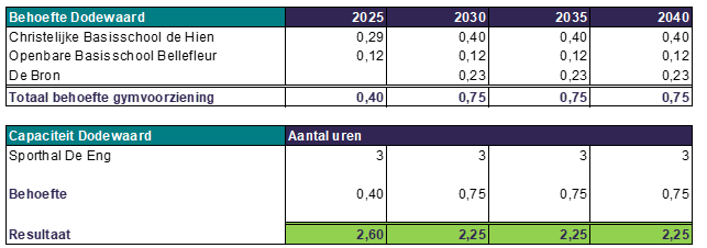De capaciteit voor bewegingsonderwijs in Dodewaard is ruim voldoende. Hoewel de behoefte in de toekomst zal toenemen door de komst van de nieuwe vestiging van De Bron, blijft de beschikbare capaciteit toereikend. De analyse laat zien dat er geen aanvullende maatregelen nodig zijn. De huidige situatie is voldoende toekomstbestendig.