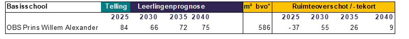 De ruimtebehoefte van OBS Prins Willem Alexander sluit goed aan op de beschikbare ruimte. De omvang van de school leidt ertoe dat de exploitatie uitdagend is. Dit neemt niet weg dat het schoolbestuur inzet op duurzaam behoud van de school.