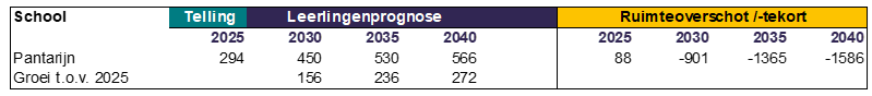 De Pantarijn in Kesteren laat volgens de leerlingenprognose een structurele groei zien. Rond 2030 worden circa 156 extra leerlingen verwacht, oplopend tot een toename van 272 leerlingen in 2040 ten opzichte van 2025. Deze groei heeft grote impact op de huisvestingscapaciteit.