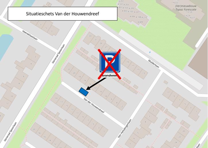 Op Van der Houwendreef, ter hoogte van. nr. 14 één parkeerplaats op te heffen ten behoeve van parkeren voor de brandweer: