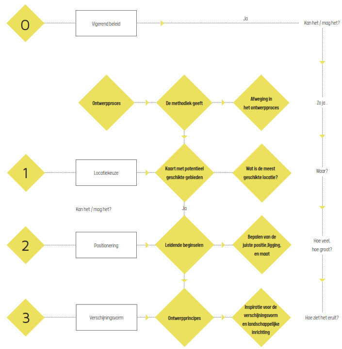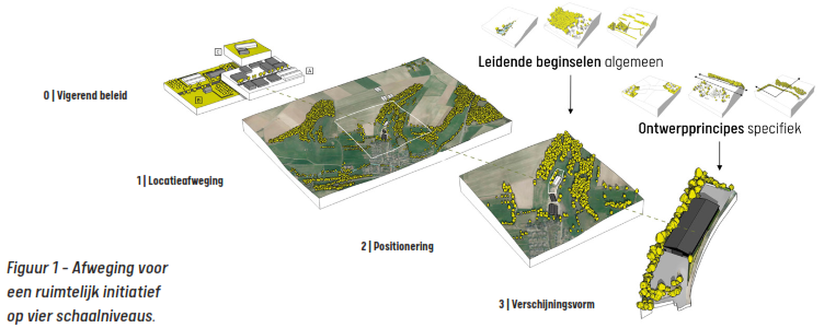 Schaalniveau 0 wordt gevormd door vigerend beleid in het betreffende gebied. Dit schaalniveau bestaat uit specifiek Rijks- of regionaal beleid. Schaalniveau 1 betreft de locatieafweging en bepaalt vanuit een landschappelijke analyse de meest geschikte locatie voor een initiatief. Hierna volgt op schaalniveau 2 de positionering ter plaatse, waarmee bijvoorbeeld de opstelling wordt bepaald. Op dit schaalniveau is het gewenst een balans te vinden tussen de maat en schaal van de ontwikkeling en het landschap. Op schaalniveau 3 volgen overwegingen over de verschijningsvorm. Hieronder worden alle fysieke kenmerken verstaan die de relatie tussen de ingreep en het initiatief harmoniseren en waar mogelijk versterken. Dit aan de hand van ontwerpprincipes.
