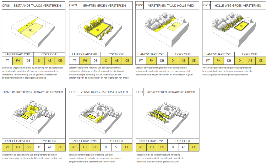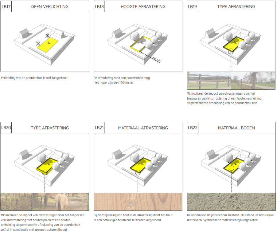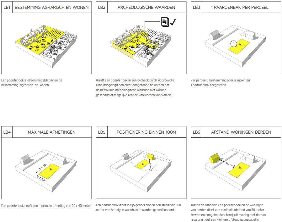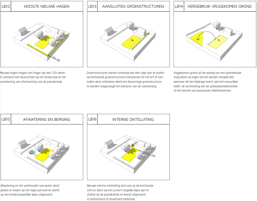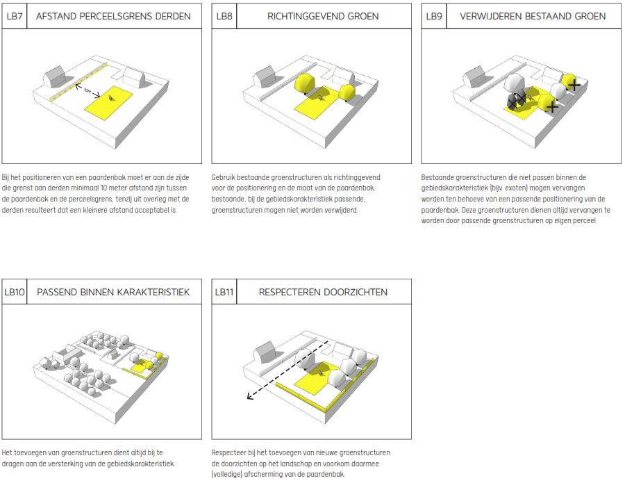 De leidende beginselen zijn in alle gevallen van toepassing. Ze bieden de initiatiefnemer houvast en handvaten bij het vormgeven van een initiatief voor een paardenbak (zie Figuur 6). Leidende beginselen zijn van toepassing op het eigen perceel (bijv. vervangen bestaand groen; LB9).