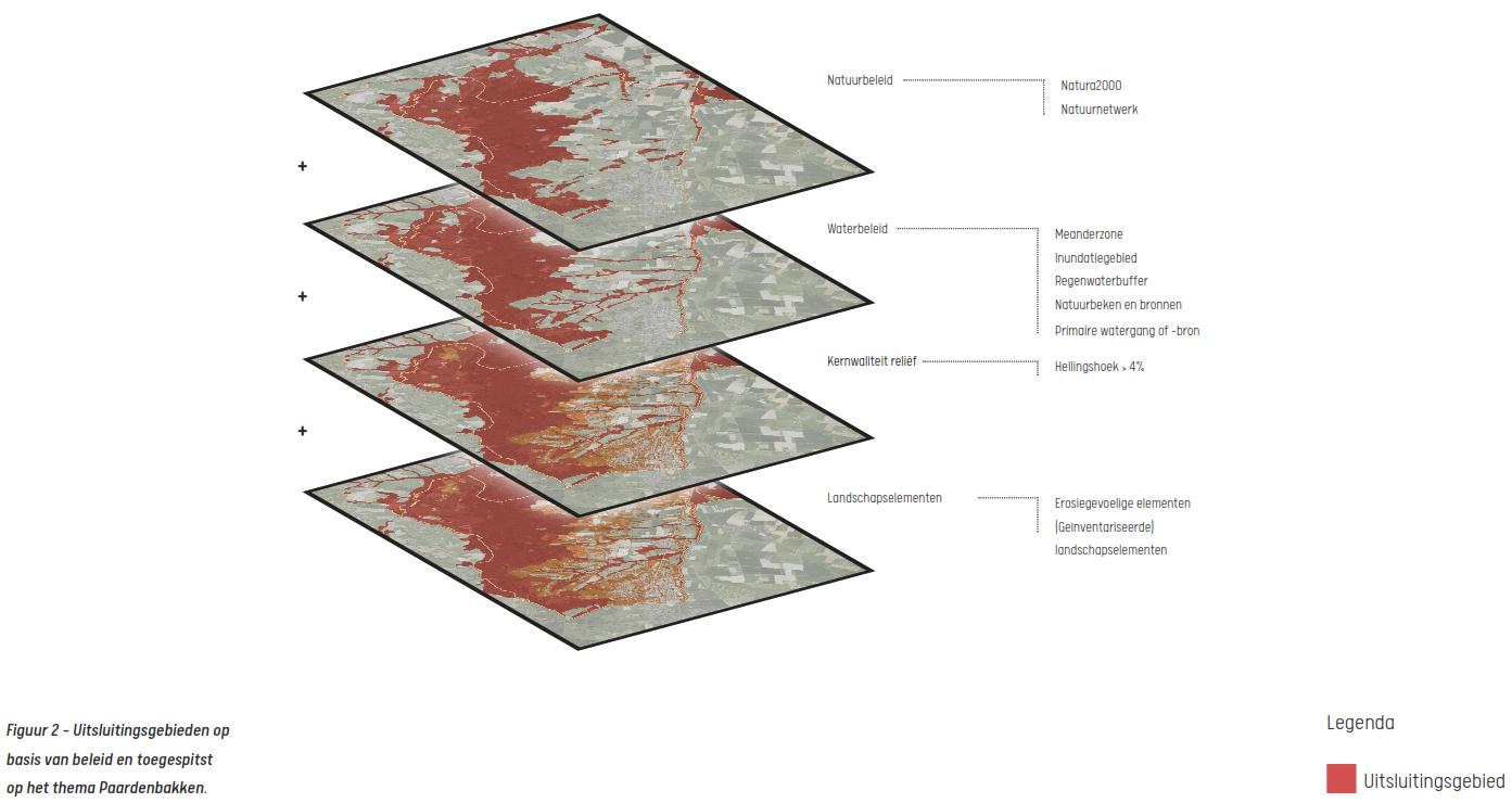 Deze uitsluitingsgebieden zijn vastgesteld op basis van beleid en toegespitst op het thema paardenbakken. De kaart met uitsluitingsgebieden is opgebouwd uit de volgende lagen (zie Figuur 2):