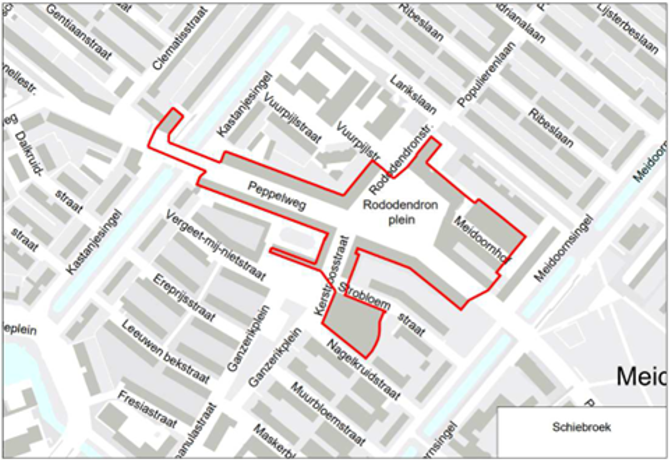 Als aangewezen gebied als bedoeld in artikel 1 van de Verordening bedrijveninvesteringszone gebruikers en eigenaren Winkelcentrum Schiebroek 2026 geldt onderstaande omschrijving zoals tevens aangeduid op onderstaande kaart.