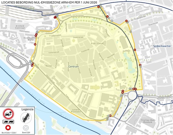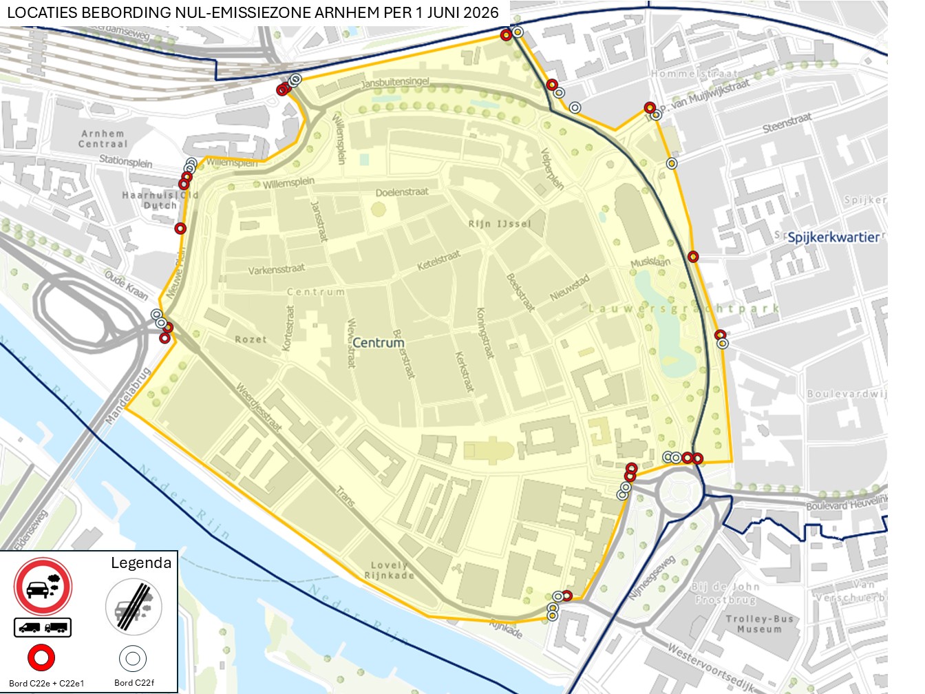 Om het gebied in de gemeente Arnhem dat is aangegeven op de volgende afbeelding per 1 juni 2026 aan te wijzen tot nul-emissiezone voor bedrijfsauto’s en vrachtauto’s, toegankelijk voor emissieloze voertuigen, door het plaatsen van de volgende borden, op basis van het per 1 januari 2026 geldende RVV 1990: