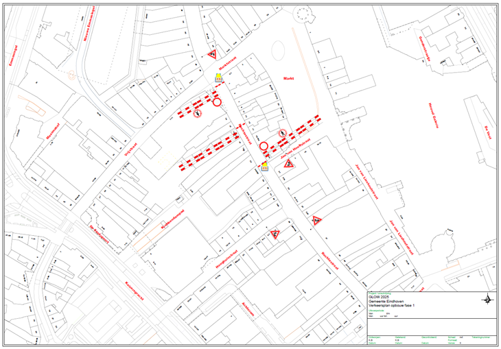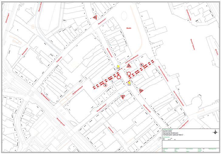 De tijdelijke maatregelen zijn weergegeven op tekeningen ‘GLOW 2025 Gemeente Eindhoven’: verkeersplan 2025—V5, verkeersplannen opbouwfasen 1 en 2’ en beschreven in het document ‘Verkeersinformatie Glow 2025’. De tijdelijke omleidingsroutes zijn weergegeven in het document Verkeersplan 2025-omleidingen-V2’. Deze vijf documenten zijn als bijlagen aan dit besluit toegevoegd.
