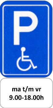 Vaststellen: Gehandicaptenparkeerplaats gedurende aangegeven dagen en tijden (bord E6 conform Bijlage 1 van het RVV1990 met onderbord “OB: ‘ma t/m vr 9.00-18.00h”)