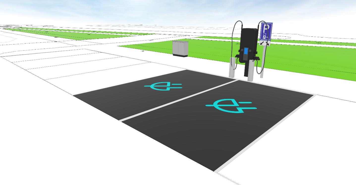 Het is op deze plek handig om tijdens het parkeren snel de elektrische auto op te kunnen laden. We plaatsen hier daarom geen gewone laadpaal maar een snellaadpaal. Bij deze snellaadpaal kunnen twee auto's opladen. We veranderen bij deze snellaadpaal daarom twee parkeerplaatsen in twee parkeerplaatsen die bedoeld zijn voor het snel opladen van elektrische auto’s.