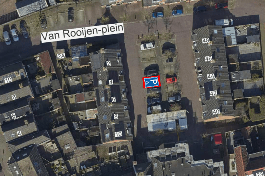 • Het hof van het Van-Rooijenplein is een wegvak waar parkeren in de vakken is vereist vanwege een niet toereikende wegbreedte. De maatregel bestaat uit het reserveren van een parkeerplaats in de nabijheid van de woning, dit om de loopafstand zo kort mogelijk te houden. Gezien de parkeerdruk in de omgeving is ervoor gekozen hiervoor een algemene parkeerplaats om te zetten naar een gehandicaptenparkeerplaats op kenteken.