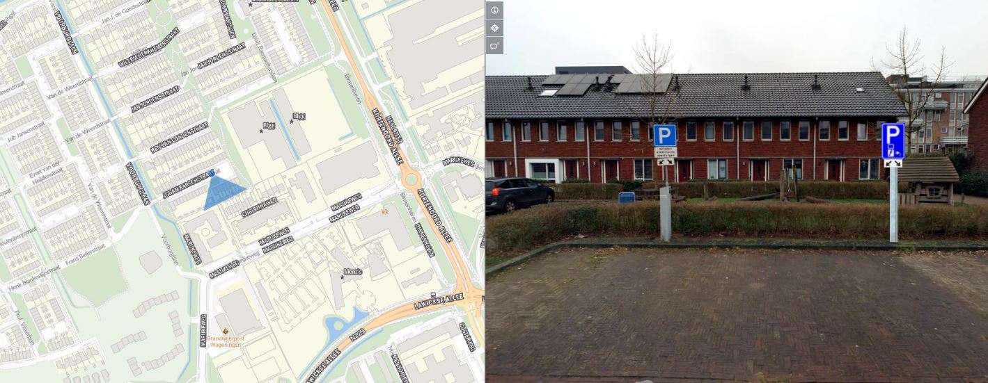 In de afbeelding hierboven staat links met een blauwe driehoek aangegeven waar de laadpaal gaat komen. Rechts kunt u zien welke twee extra parkeervakken gereserveerd worden.