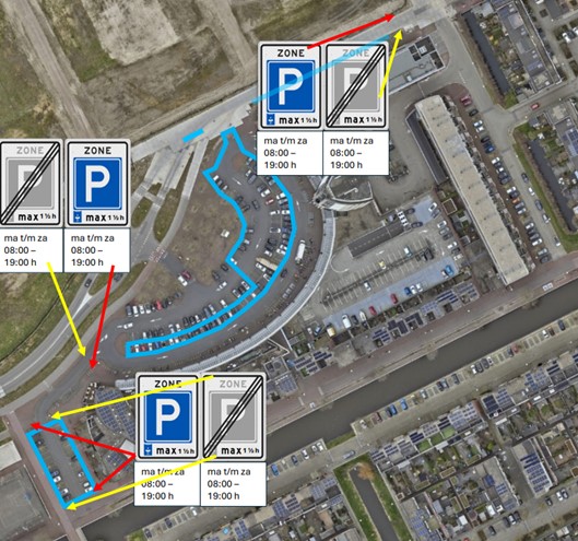door het plaatsen van de borden E10 en E11 van bijlage 1 van het RVV 1990 met opschrift “parkeerschijficoon 1 ½ h” en onderbord waarop het opschrift “ma t/m za 08:00 tot 19:00h” en het aanbrengen van blauwe strepen zoals bedoeld in artikel 25 van het RVV 1990;